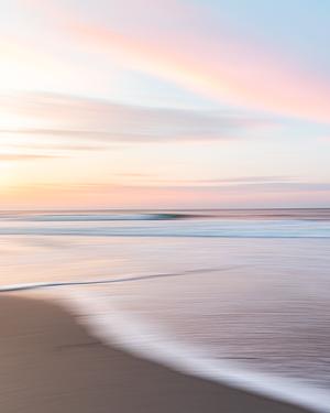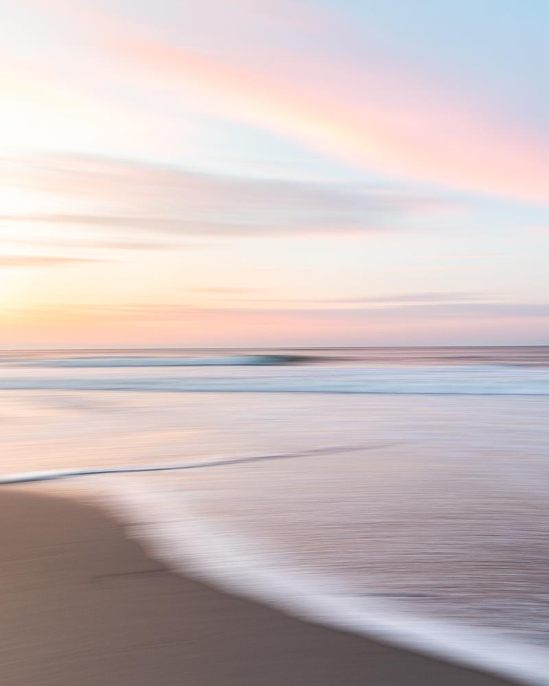 A pan blur blends pastel sunrise colors together at Ponquogue Beach, Long Island, NY.