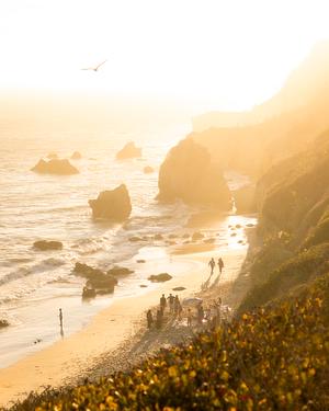 The view at sunset looking north at El Matador beach in Malibu, CA. September 2021.