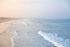 A lone surfer walks his board out at sunrise. Captured looking south from the Manhattan Beach Pier, CA.